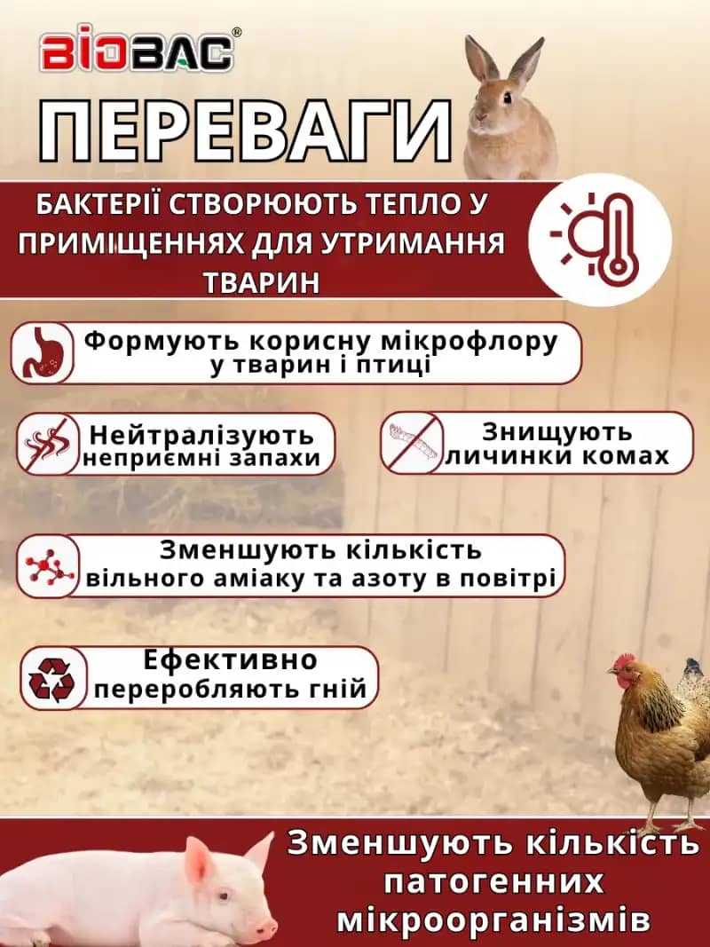 Бактерії нейтралізують запахи, у тому числі аміачні, створюють тепло в холодну пору року й активно компостують послід та солому.