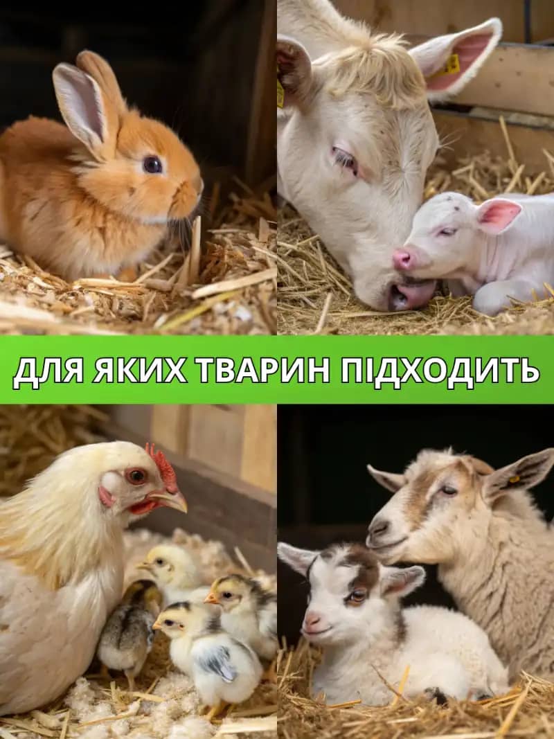 Препарат універсальний — підходить для птахів, свиней, великої рогатої худоби, кіз, овець і кроликів.