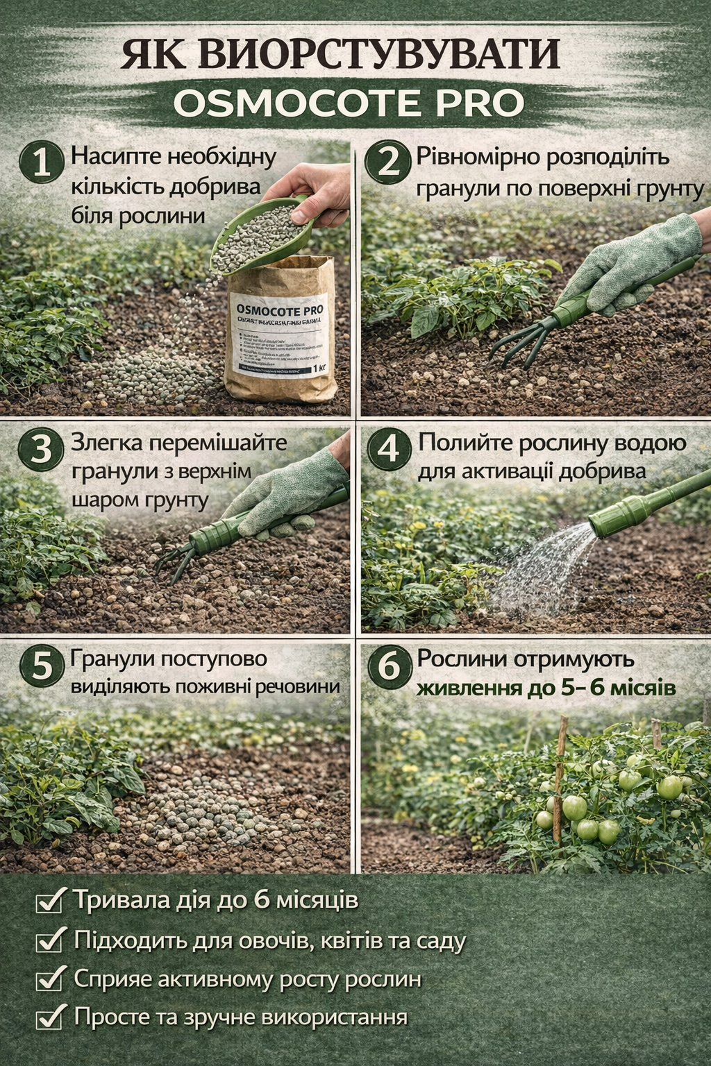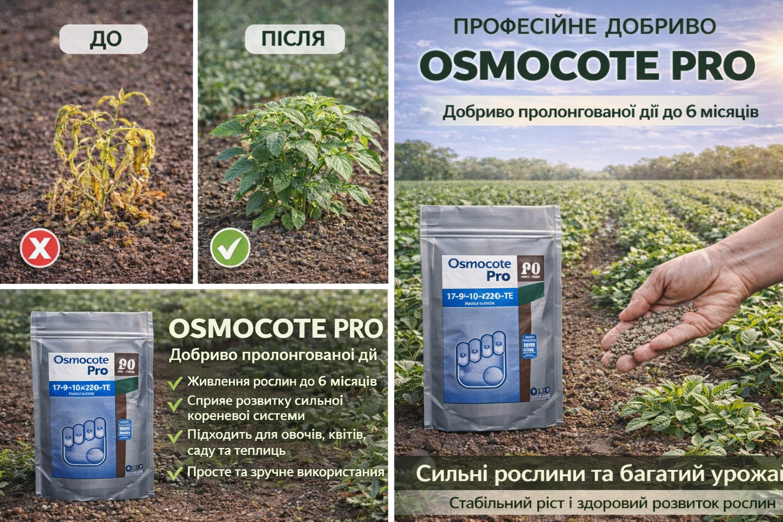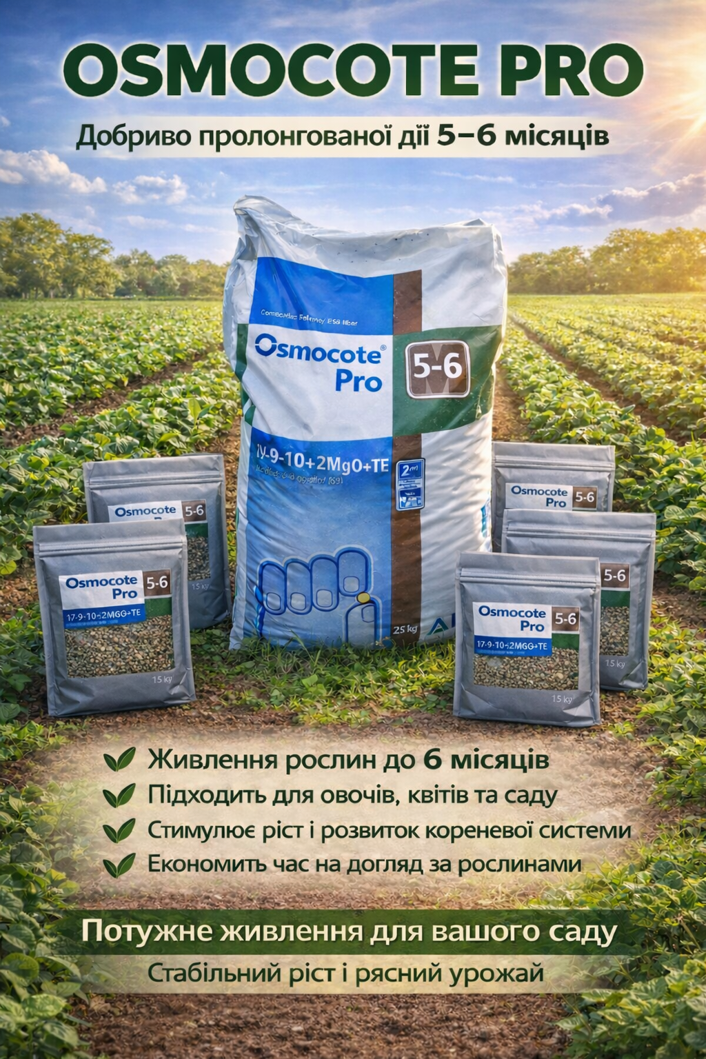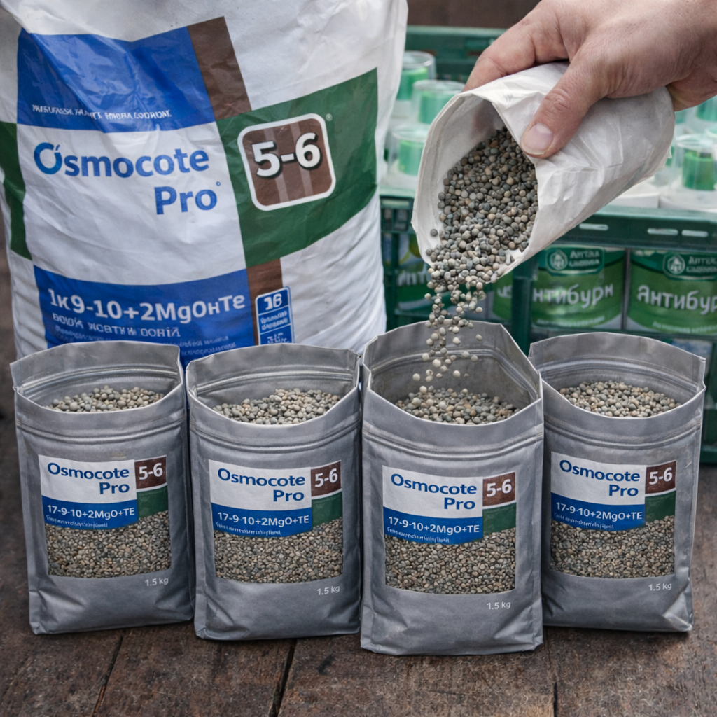 1️⃣ Osmocote Pro — професійне добриво пролонгованої дії для активного росту рослин. Забезпечує рослини поживними речовинами до 5–6 місяців.