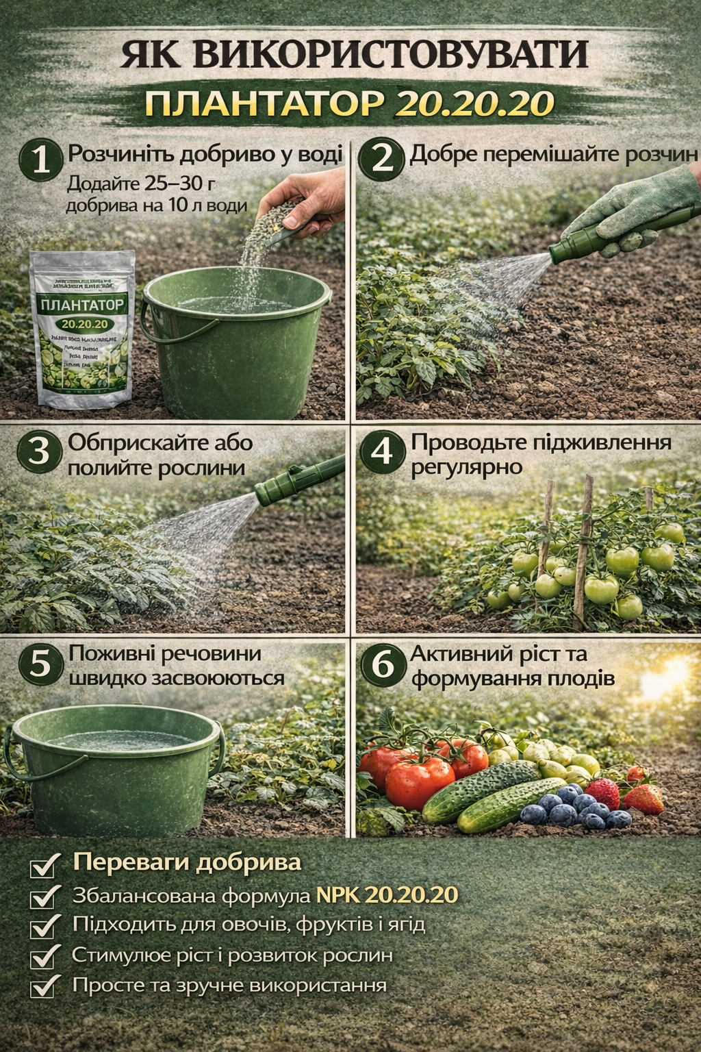 3️⃣ Підходить для овочів, фруктів, ягід, садових і тепличних культур. Допомагає підтримувати здоровий ріст та розвиток рослин.